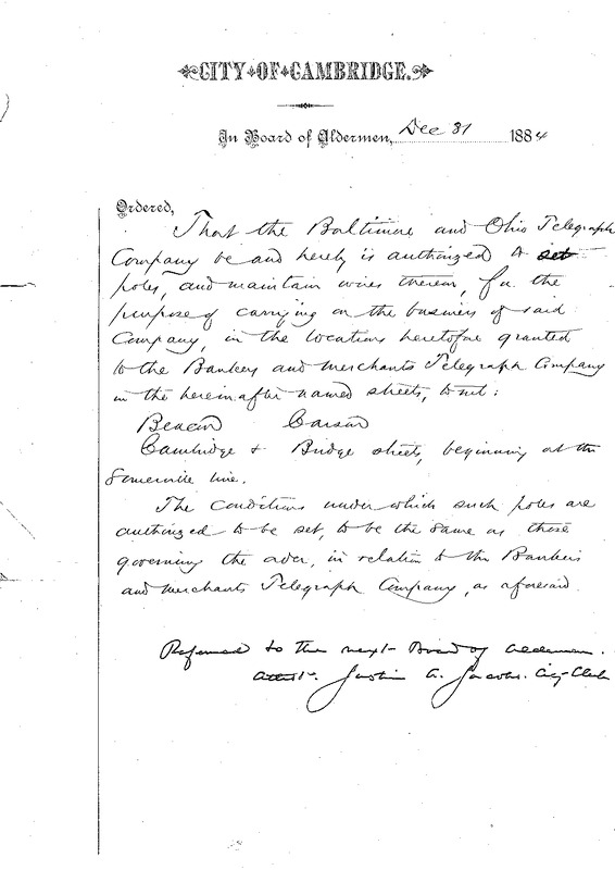 - Order authorizing the Baltimore and Ohio Telegraph Co. to set poles. Dec. 31, 1884