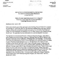 - A communication was received from Commonwealth of Massachusetts, Department of Environmental Protection, transmitting notification of License Application Waterways License Application for Cambridge Reserch Park, LLC, on Thursday, June 24, 1999 at 7:00 at the Kennedy Community School.