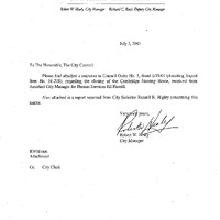 - A communication was received from Robert W. Healy, City Manager, forwarding a response from Jill Herold, Assistant City Manager for Human Services and a report from City Solicitor Russell B. Higley relative to Council Order #5 of June 25, 2001 (Awaiting Report Item No. 01-208) regarding the closing of the Cambridge Nursing Home.