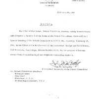 - Comm. from Alice K. Wolf, Chairman, Sub-Comm. on Desegregation, transmitting notice of a special meeting of the School Committee for Tuesday Feb. 24, 1981 in cafeteria.