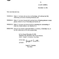 - Vice Mayor Reeves resolutions on the 20th Anniversary or Robert J. Lurtsema as host of morning Promusica.