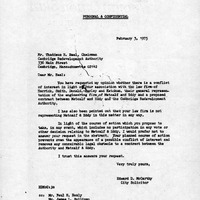 - An opinion from Edward D. McCarthy, City Solicitor to Thaddeus R. Beal, Chairman of the Cambridge Redevelopment Authority over a "conflict of interest"