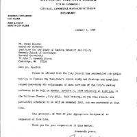 - Comm. from Dr. Nancy Rigotti, Assoc. Dir., Harvard University Institute For the Study of Smoking Behavior and Policy, transmitting in connection with this evening's hearing the Discussion Paper Series entitled "Implementation and Impact of a City's Regulation of Smoking in Public Places and the Workplace: The Experience of Cambridge, Massachusetts".