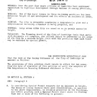 - Petition of Arthur C. Parris, Chairman of the Planning Board, with a proposed amendement to the Zoning Ordinance of the City of Cambridge in Article I, Section 5 and Article V, Section 2 which would create relief by Special Permit subject to proposed height restriction.