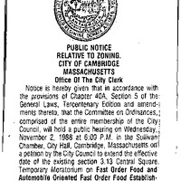 - Re: request than an extension of the Central Square Fast Food Moratorium to December 31, 1988 be referred to a public hearing.