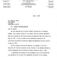 - Petition of Terry Crystal, East Harvard Sq. Neighborhood Assoc., et al, to amend the Zoning Map by rezoning from Residence C-3, Office 3 & Business B to Residence C-1 in the Harvard St., Mass Ave., Remington St., Mt. Auburn St., Putnam Ave., Banks St., Arrow St., Bow St., Quincy St., Plympton St., JFK St., Winthrop St., Holyoke Pl., Holyoke St., South St., & Portland St. area.