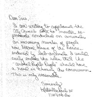- Comm. from Kirsten Michaels, applauding the City Council for its legislative efforts concerning laboratory animal experimentation