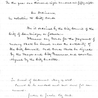 - An Ordinance in relation to City Bonds; whenever any bonds for the paymnet of money shall be issued under the authority of the city Council, such bonds shall be signed by the Mayor and City Treasurer and countersigned by the City Auditor.