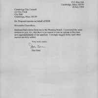 - A com. received from Dan Geer regarding a letter he sent to the Planning Board in reference to the upzoning on behalf of KKR.