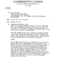 - Comm. from Councillor Alice K. Wolf re: her impressions of the discussion & motions with regard to the linkage & inclusionary zoning petitions, made at the Council meeting of February 25, 1985.