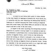 - Communication from the Metropolitan District Commission in response to orders of the City Council adopted on November 22, 1938 relative to the following matters: 1. Relative to equipping locker building at Magazine Beach with shower baths. 2. Relative to locating lights to be operated by hand on Memorial Drive at Magazine St.