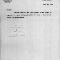 - Order relative to repairing drinking fountain at corner of Mass. Ave and Harvey Street.