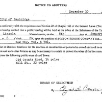 - Notice recevied from Town of Lincoln of Hearing to be held at office of Selectman of Town of Lincoln on Mass. January 8, 1951 upon the petition of Boston Edison Co. for the erection of 16 poles on Old County Road and 22 poles on Mill St.