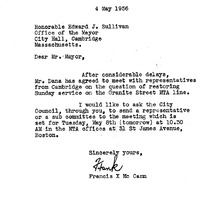 - Communication from City Manager transmitting one from Seneate Fancis X Mc Cann relative to a representative of a sub Committee meeting whic is set for Tuesday May 8th at 10:30 am in the MTA office at 31 st James Ave, Boston rel. to restoring Sunday Service on Granite Street MTA line