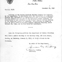 - Communication from Dept of Public Utilities notifying City Council of hearing to be held on Thursday Jan 9,1947 on the petition of Boston Elevated Railway Co for Alterations and Additions to the Kendall Square surface station of the Cambridge Subway