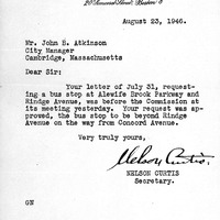 - Communication from the City Manager trasmitting one from Met. District Commission approving Buss stop to be Legend Bridge Ave. on the Way from Concord Ave.