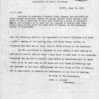 - Communication from Dept, of Public Utilities with notice of hearing to be held on Wed. June 27 1951 on petition of Cambridge Electric Light Co. for authority to issue 10,00 additional shares of commin stock