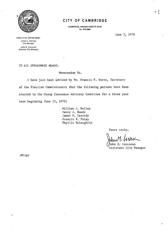 - Communication from John H. Corcoran notifying the City Council of the following Appointments to the Group Insurance Advisory Committee - William J. Kelley Henry J. Woods James P. Cassidy Francis X. Foley Phyllis McLaughlin