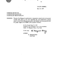 - Councillors Reeves, Galluccio and Triantafillou re: Request receipt by the mid-summer meeting of the Law Dept.'s opinino relative to the Growth Management petition.