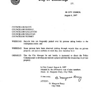 Councillor Davis re: Execute a plan to prevent trespassing on private property by persons retrieving bottles for redemption center.